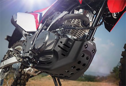 Ketiga, ada skid plate. Kalau bahasa awam, mungkin bisa disamakan dengan pelindung mesin. Berbahan abs keras, benda ini melindungi area bawah mesin dari hantaman kerikil dan lumpur yang menciprat dari roda saat melintasi jalan berlumpur dan jalan offroad.