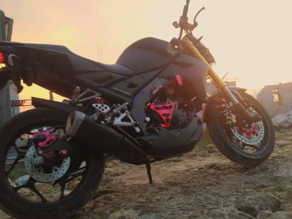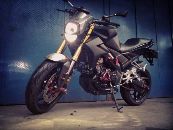 Swing arm kepunyaan Yamaha R15 V2 nemplok manis menggantikan swing arm orisinal yang ceking. Lalu perangkat pengereman cakram belakang masih andalkan R15 V2 yang dijepit kaliper New Jupiter MX yang tentunya duduk manis di breket custom salah satu gerai modifikasi. Terakhir, sekujur body dilabur kelir hitam doff yang makin menguatkan kesan gahar motor ini dan ditutup silincer orisinal Yamaha MT-25 yang nemplok sebagai pelepas gas buang. Gimana, mantap kan? Beneran gahar to?