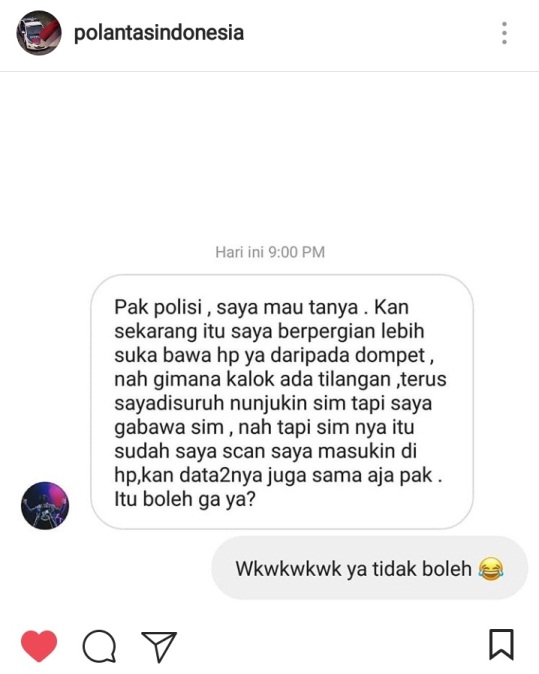 Sontak, pertanyaan yang entah lugu beneran sehingga bertanya atau melucu ini menuai banyak tanggapan. Beragam komentar muncul, hingga akhirnya sang admin dari akun resmi Polantas ini memberikan jawaban. Jelasnya “TIDAK”. Saat pemeriksaan dalam razia lalu lintas, pengguna jalan harus dapat menunjukkan SIM dan STNK ASLI dari kendaraan. Ingat ya, ASLI, bukan file scan atau foto yang disimpan di gadget. Hal ini karena memang undang-undangnya mengatur demikian. UU Nomor 22 Tahun 2009 tentang Lalu Lintas dan Angkutan Jalan, saia ambil contoh nih tentang SIM :