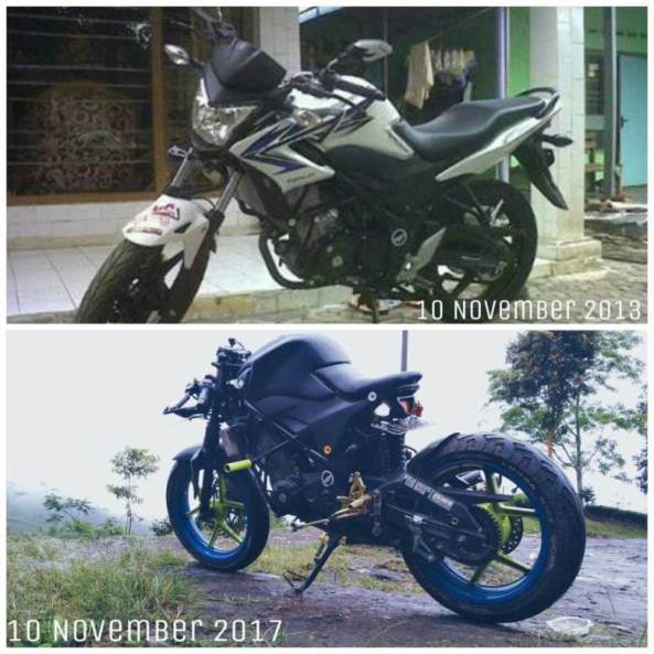 Modifikasi, memang mutlak adalah selera pemilik. Yang sreg, yang cocok, ya itu yang dilakoni dan dipilih. Motor segala macam, bisa berubah bentuk dan gaya, sesuai keinginan pemiliknya. Contohnya, Honda CB150R gen 1 ini. Sport naked Honda yang menggunakan sasis bermodel tralis, diubah rada ekstrem oleh salah seorang pemiliknya dari tanah pasundan.