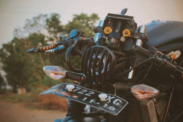 Setang bawaan, juga dilepas, digantikan dengan setang model jepit. Lha ekstremnya , posisi setang jepit nggak diatas segitiga atas, melainkan di tengah-tengah, antara segitiga atas dan segitiga bawah. Alhasil, posisi berkendara jadi merunduk banget. Ya merunduk, ya menunduk..yang jelas posisi setang lebih rendah ketimbang tangki nih