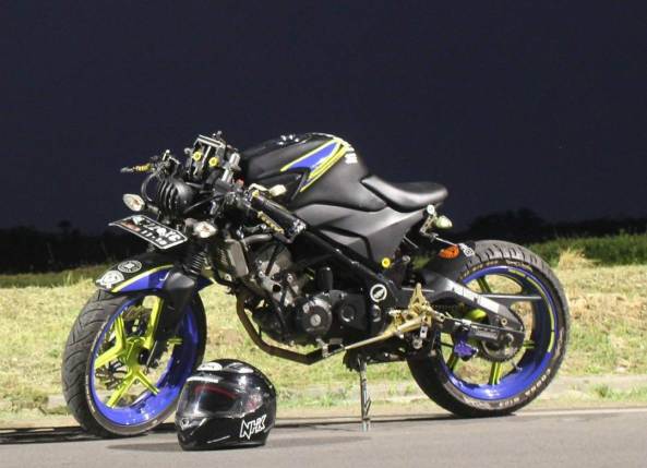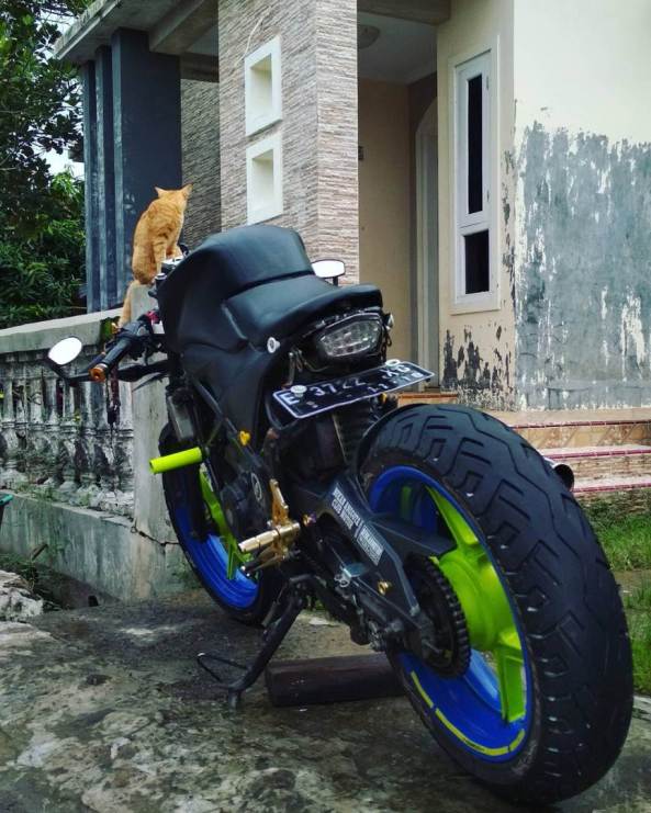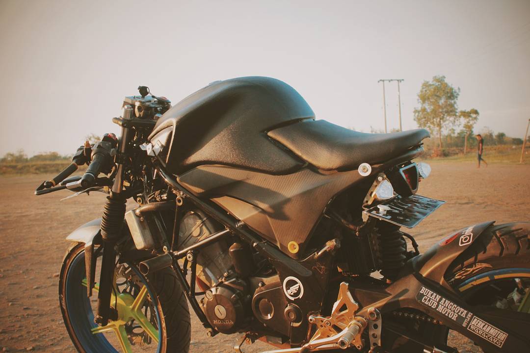 Modifikasi, memang mutlak adalah selera pemilik. Yang sreg, yang cocok, ya itu yang dilakoni dan dipilih. Motor segala macam, bisa berubah bentuk dan gaya, sesuai keinginan pemiliknya. Contohnya, Honda CB150R gen 1 ini. Sport naked Honda yang menggunakan sasis bermodel tralis, diubah rada ekstrem oleh salah seorang pemiliknya dari tanah pasundan.
