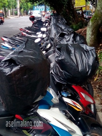 Kreatif kan? Ide jukir di area parkir Jl Bromo ini memang unik dan perlu diapresiasi. Sepele memang, hanya berbekal kantong kresek hitam sebagai penutup helm yang nangkring di sepeda motor konsumen. Tapi, manfaatnya sangat terasa bagi pemilik kendaraan. Saat hujan turun dengan derasnya, maklum musim hujan yang hampir setiap hari dihujani air dengan volume mantap, helm yang ada di sepeda motor, bisa aman terlindungi dari guyuran air. Alhasil, saat hendak pulang, helm tetap kering dan nyaman dipakai.