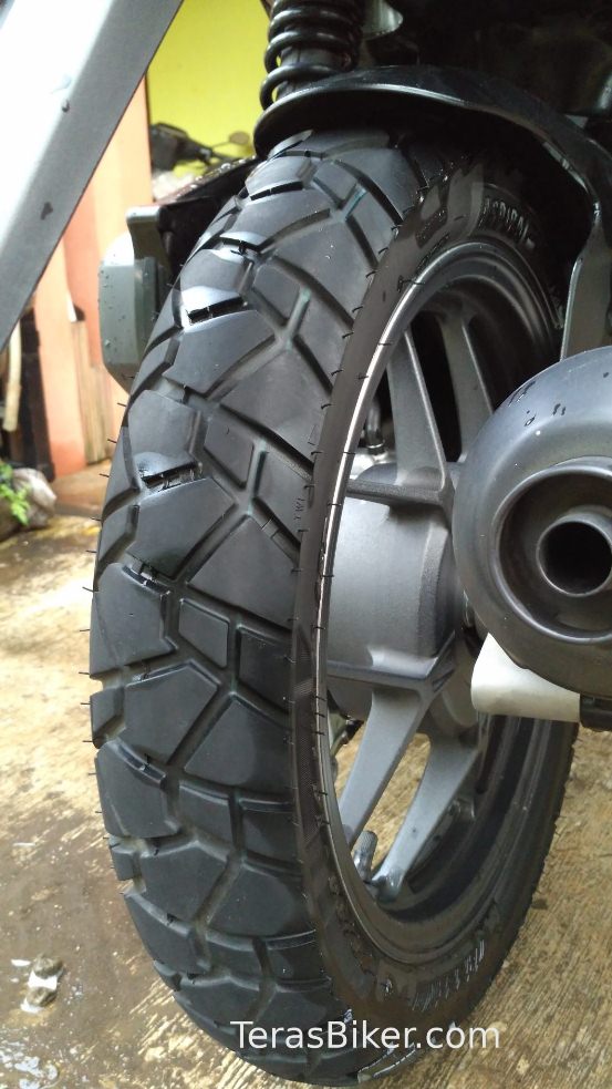 Ban, aplikasi ban tipe aspal yang kembangannya mirip dengan Mio M3. Demikian pula velg CW-nya, identik dengan saudara bermesin sama 125cc, Mio M3. Ban ukuran 80/80 didepan serta 100/70 di belakang. Kurang terasa bedanya untuk sebuah skutik yang bertitel extreme ride. Bila saja ada sisi kreatif dari pabrikan dengan membuat beda, contoh pemakaian velg jari-jari berikut ban dual purpose, makin menguatkan kesan ekstrem-nya. Nggak usah deh ban pacul alias ban trail, ban dual purpose sudah cukup beda kok. Macam Aspira Premio Terrano, Swallow SB-117 atau lainnya. Jamin deh, makin eye catching.