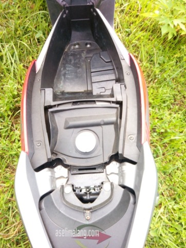 Buka jok, tersedia ruang bagasi yang modelnya rada melebar namun dangkal. Dangkal, karena sisa ruangan terpakai untuk tempat aki. Beda dengan skutik yang posisi akinya pindah ke bawah dek, sehingga ruang bagasi bisa lebih dalam.