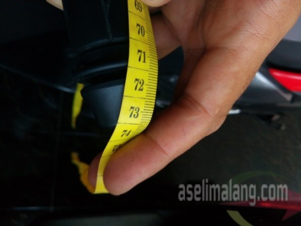 Setang ini, bila dibanding dengan setang kebanyakan skutik lain, lebih panjang/lebar. Coba deh, saia bandingkan dengan setang Honda Vario 110 punya istri. Hmm..lumayan bedanya. Saat diukur dari ujung setang/bandul, setang Vario punya panjang 66 cm sementara setang X-Ride 125 mencapai angka 73 cm.