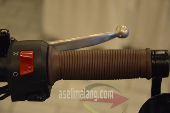 Setang juga berganti dengan model rada baplang, mirip fatbar. Pengendalian lebih nyaman dan tampilan juga lebih gahar. Grip gas, karetnya digangi dengan model klasik menggembung berkelir coklat yang juga kalem. Sebagai pelengkap keselamatan berlalu lintas, sepasang spion bulat duduk manis di ujung setang. Akrab disapa dengan nama spion jalu.