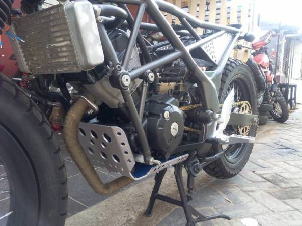 Di tangan modifikator asal Makassar sono, berngaran Fourtysix Motorcycle, OCB ini diacak-acak abis deh. Dipereteli semua mulai tangki hingga body, menyisakan rangka tralisnya. Setelah ditelanjangi, ada sedikit ubahan pada rangka. Terutama pada rangka belakang yang diperpendek supaya ringkas. Sementara, rangka utama hampir tak mengalami ubahan drastis, hanya merapikan. Intip tuh, bentuk utama tralis masih kuat kan?