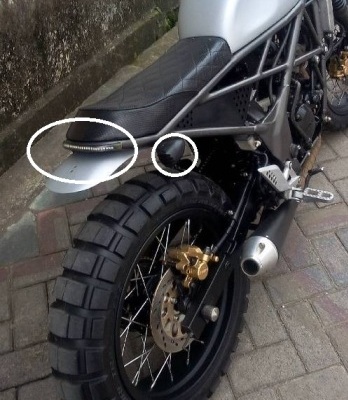 Bingung lampu belakang dan lampu remnya? Mana nih? Tuh, dipasang LED tipis alias LED strip pada lengkungan rangka belakang, yang berfungsi sebagai lampu belakang. Untuk lampu sein, terpasang lampu kecil berbentuk bulat pada bagian rangka bawah jok. Salut, tetap tertib peraturan lalu lintas nih