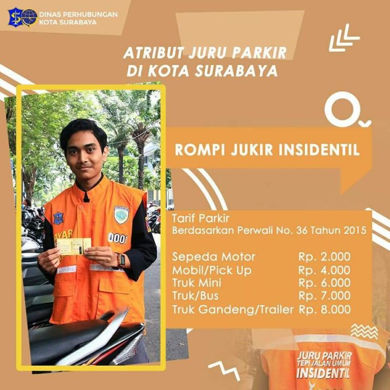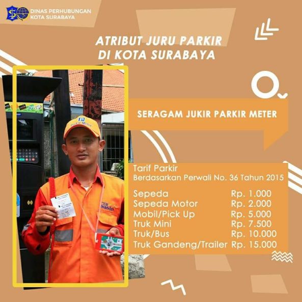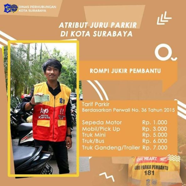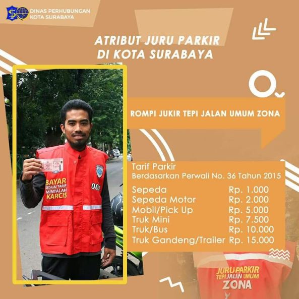 Pemerintah Kota Surabaya , melalui akun media sosial Dinas Perhubungan setempat, memberikan sosialiasi kepada masyarakat tentang adanya ragam rompi jukir (juru parkir) yang ada di wilayah kota Surabaya berikut semua perbedaan warna dan identitasnya. Karena ternyata , perbedaan dari 5 jenis rompi jukir tersebut juga berpengaruh pada besaran tarif parkir yang dikenakan. Nah lo..