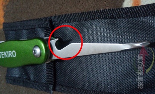 - Fungsi pisau lipat. Cukup dicongkel dengan menggunakan ujung kuku, beragam tool akan nongol. Salah satunya pisau pemotong ini. Meski bentuknya kecil, tajam juga lho. Bisa lah kalau untuk memotong kabel atau benda lain yang ukurannya nggak terlalu besar.