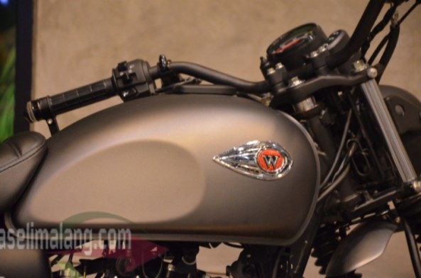 Area mesin, masih standar. Kapasitas tetap, karena diyakini sudah cukup mumpuni untuk meladeni keinginan rider. Penyempurnaan, ada pada saluran gas buang alias knalpot. Knalpot standar W175, dicopot. Gantinya, knalpot custom racikan Smoked Garage yang punya aliran scrambler. Khasnya, bentuk ala udang meliuk ke samping blok mesin, bukan ke bawah seperti knalpot umumnya sepeda motor. Setelah meliuk ke atas samping bak mesin kanan, menyambung ke belakang berujung pada silincer di samping jok. Asik banget kan modelnya? Jadi ingat knalpot ala grasstrack