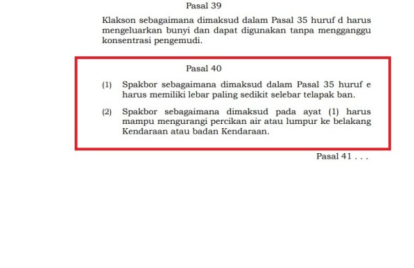 Sepatbor, harus memiliki lebar paling sedikit selebar telapak ban, dan harus mampu mengurangi percikan air atau lumpur ke bagian belakang kendaraan