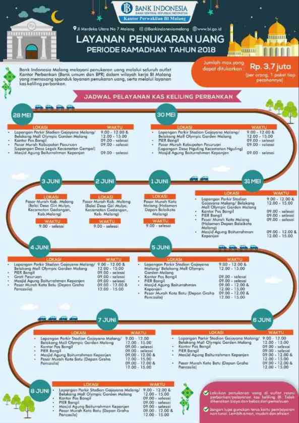 Nah, berupaya memenuhi animo masyarakat, pemerintah, dalam hal ini Bank Indonesia Malang dan Pemerintah Kota Malangmenyiapkan beberapa lokasi yang melayani penukaran uang baru dengan beragam nominal di wilayah Kota Malang. Dibuka sejak Senin 28 Mei 2018, layanan ini akan dibuka sampai dengan tanggal 8 Juni 2018.