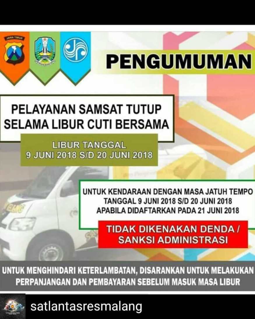Cuti bersama alias tutup berbarengan ini juga berlaku untuk layanan SIM yang merupakan bagian dari kepolisian serta Samsat dari dinas pendapatan. Samsat dan Satpas SIM di Malang, juga menutup layanan terhitung hari ini 11 Juni 2018. Layanan terakhir dibuka pada hari Sabtu lalu, 9 Juni 2018. Makanya, sempat saia lihat juga parkiran  kendaraan yang penuh sesak di Satpas SIM Kabupaten Malang. Maklum, banyak yang sengaja meluangkan waktu dengan pikiran sama, takut SIM-nya kadaluwarsa dan mati. Bakal ribet kan, karena harus bikin SIM baru, mendingan sebelum libur saja rame-rame mengurus SIM