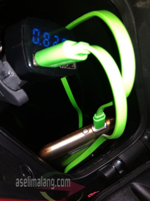 Nah, saia coba menggunakan untuk charger alias mengisi daya ponsel. Kebetulan, punya adaptor alias charger DC outlet, yang punya soket khusus untuk sumber daya DC. Jamak disebut DC Car Charger karena biasa dipakai di colokan lighter mobil.
