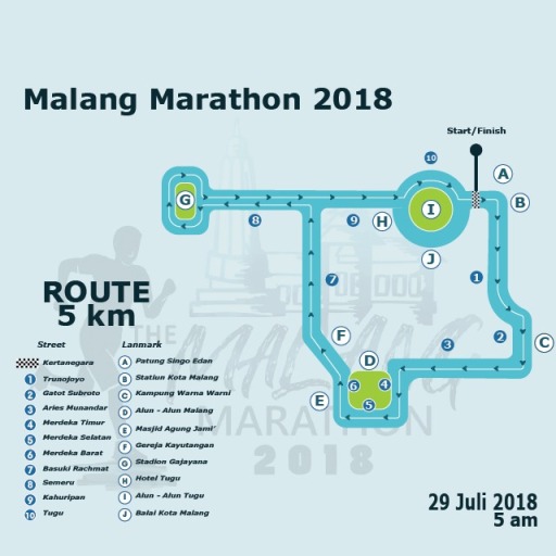 Posisi start dan finish sama, di timur Tugu Balaikota Malang. Rute 5 km antara lain menyusuri Jalan Kertanegara (stasiun KA)  – Jl Trunojoyo – Jl Gatot Subroto – Jl Aries Munandar – mengelilingi alun-alun kota Jl Merdeka Timur – Jl Merdeka Selatan – jl Merdeka Barat – Jl Basuki Rahmat – Jl Semeru – Jl Kahuripan dan berakhir di Jl Tugu. Berikut rutenya