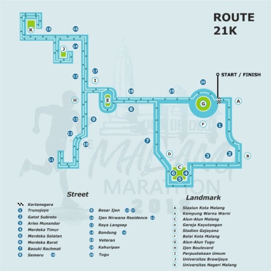 Lari Marathon menyusuri jalan-jalan di Kota Malang ini, rencananya akan start dari kawasan Tugu Kota Malang pada pukul 05.00 WIB. Ada 3 kategori sekaligus dalam marathon ini yaitu kategori 5 km , kategori 10 km dan kategori 21 km. Bedanya? Ya jelas panjang lintasan yang ditempuh :mrgreen: