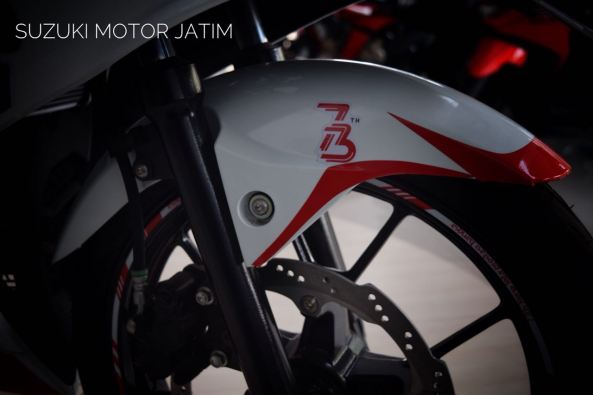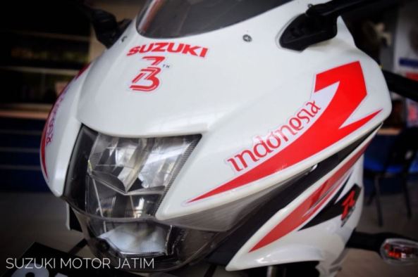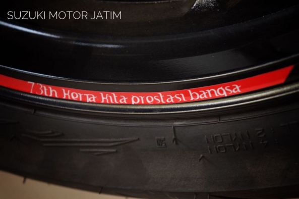 Lalu, ada cutting sticker bertuliskan Indonesia 73 tahun, persis di bawah striping Suzuki bawaannya, di fairing samping. Identitas varian ‘R’ di pojok atas samping fairing tetap dipertahankan, ditambah grafis merah lagi di bagian depan kanan dan kiri fairing plus tulisan ‘Indonesia’ . Demikian pula coretan angka 73 tahun, hadir persis di tengah-tengah fairing depan, dibawah windscreen.