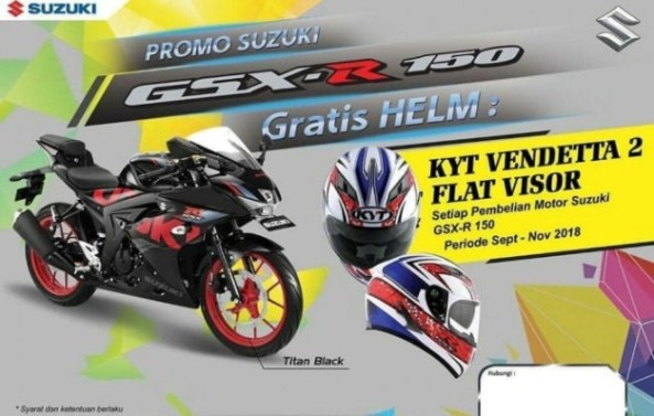 - Setiap pembelian Suzuki GSX-R 150 berhak mendapatkan 1 helm limited GSX KYT Vendetta 2 Flat Visor