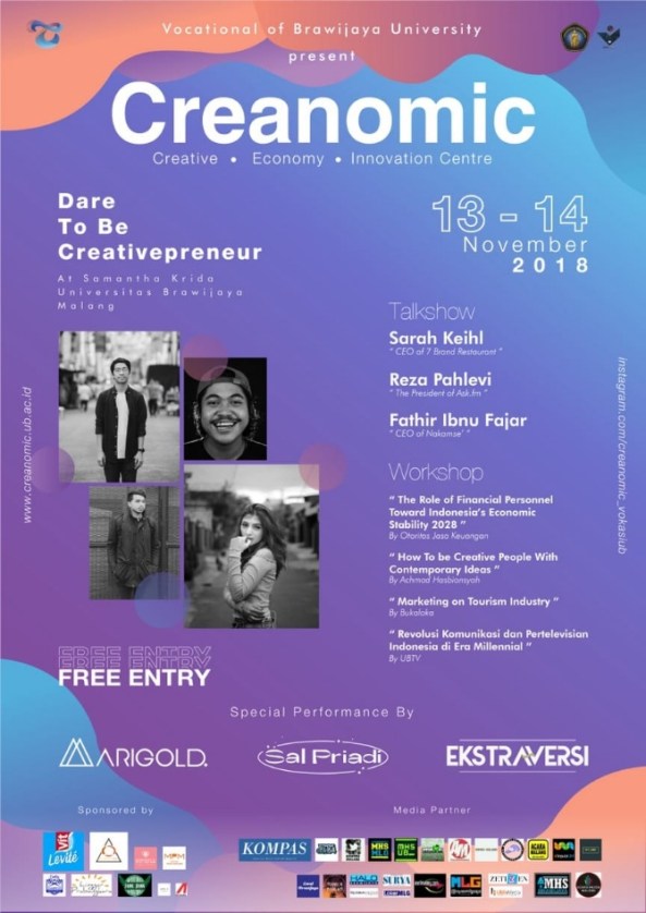 Acara talkshow dengan public figure, seminar nasional, hingga musik, bakal memanjakan peserta dan pengunjung. Dan asyiknya lagi nih, Creanomic 2018 ini gak dipungut biaya. Yuk, masbro dan mbaksis domisil Malang dan sekitarnya, sambangi deh gedung Samantha Krida Universitas Brawijaya Selasa – Rabu, 13 – 14 November 2018