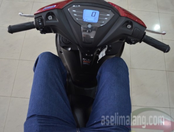 Nih skutik, ternyata nggak seimut gambarnya. Saat lihat foto dan gambar, bayangan saia, kira-kira seukuran Mio dan sejenisnya. Ternyata nggak. Lebih gede dan montok, berisi maksudnya. Lebih gede ketimbang Mio series, tapi sedikit lebih kecil dibanding Yamaha Lexi.