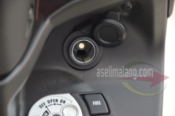 Sementara, disisi dek sebelah kanan, persis diatas kunci kontak, ada sebuah colokan, eh, power output DC. Nih solokan, siap diisi charger mobile untuk mengisi daya gadget pengendara. Sayang nih, nggak ketemu tempat untuk meletakkan gadget yang sedang diisi dayanya.