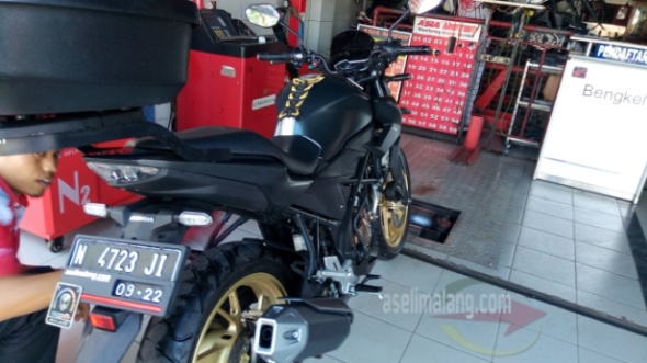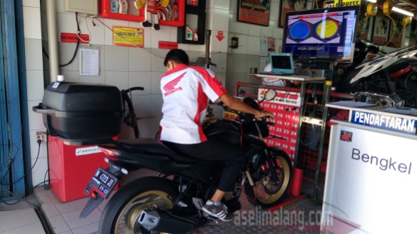Ditanyakan seputar keluhan pada motor, ya saia sampaikan kalo hanya setang dan tarikan saja. Lainnya, nggak ada. Setelah dicatat, motor dibawa ke belakang. Mau diapain? Standar layanan, yaitu motor dicuci berseih terlebih dahulu. Ajib kan? Memang sih, sudah ada beberapa bengkel resmi yang mengaplikasi layanan ini, dan itu jadi nilai plus menurut konsumen seperti saia.