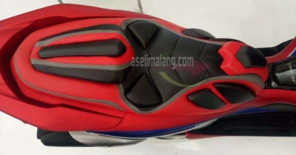 Dirombak total, dengan penambahan busa dan mengubah motif serta bentukan. Busa jok dibentuk ulang, lalu dibungkus bahan kulit MBTech dengan warna kombinasi merah dan hitam. Ada motif-motif yang dibentuk melalui jahitan, mengesankan jok yang kokoh dan nyaman diduduki. Motif bentukan serta undakan, cakep bener deh. Sekilas, bentuknya kayak keras dan kaku ya, padahal, hmm…saia tekan, empuk bener deh. Kerasan nih, naik ini jelong-jelong.