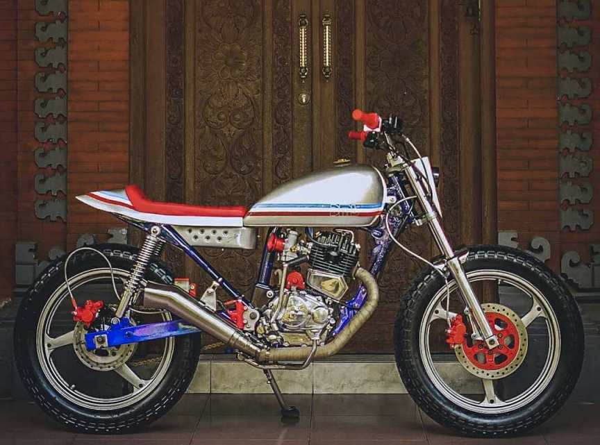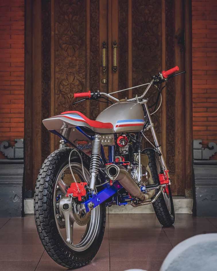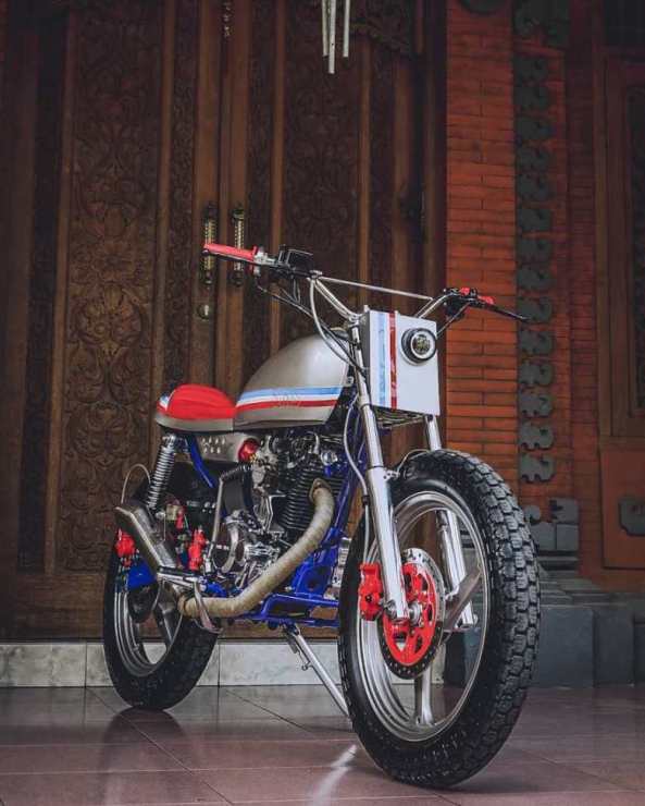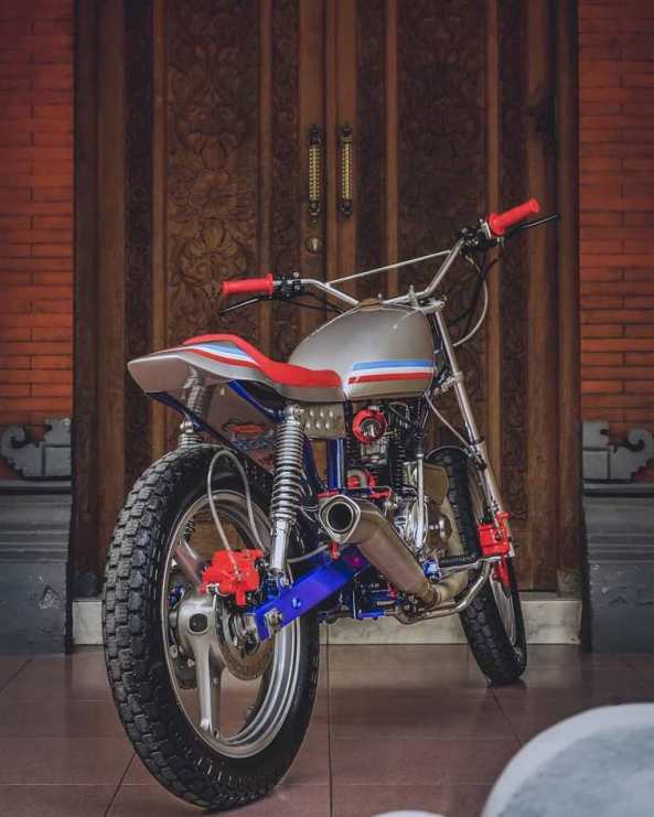 Roda dengan kembangan klasik kotak-kotak dipilih jadi bungkus si velg. Ukuran 400-18, sama depan dan belakang. Sebagai pamungkas, diguyurkan warna perak/silver sebagai warna body keseluruhan, mulai sepatbir depan yang minimalis, tangki hingga body belakang. Ditambahkan striping ala RWB nih, yaitu strip garis merah, putih dan biru sebagai pemanis. Beres