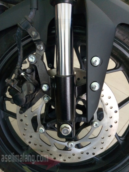 Tampang depan garang, dikombinasi sokbreker kelir emas yang terbalik. Maksudnya, sistem sokbrekernya yang terbalik, upside down alias USD. Sama nih, kayak kepunyaan Yamaha R15 VVA terbaru.