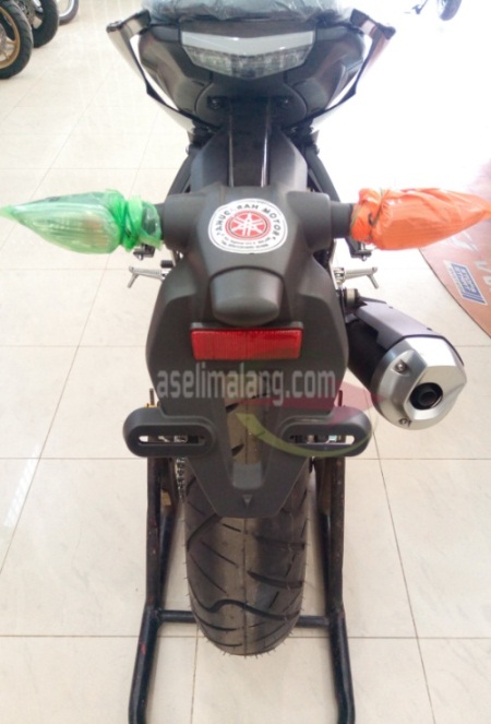 Beda dengan penampakan MT15 di Blitar dan Tulungagung kemarin, yang sudah mendahului, di Malang ada jeda waktu karena, menurut info mas jangkung tadi, terkait soal BBN dan tetek bengeknya. Oke-lah, emoh pusing ikut bahas itu, nikmati saja fisik si kuda besi ini. Tampak depan, memang seram. Asli gagah, dengan tampilan headlamp berbasis LED terbungkus dalam projector, biasa disebut LED projie, kata anak gaul. Lampu utama ya satu itu, pas di tengah. Sementara, diatasnya, ada sepasang lampu senja sipit. Macam alis dengan mata tunggal. Jangan salah lho ya, lampu utama justru yang dibawah