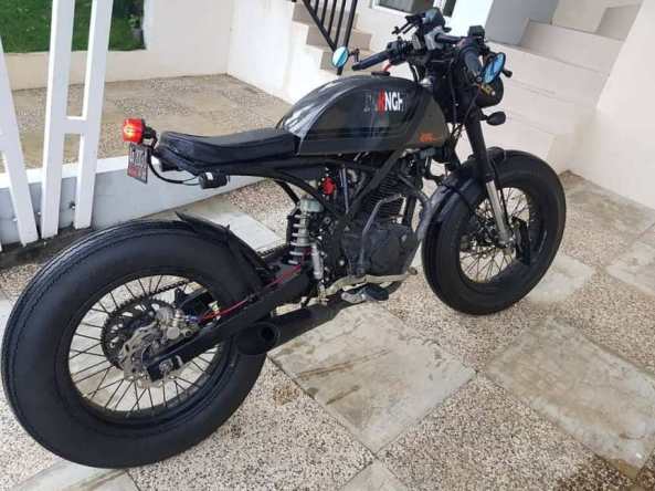 Motor jenis ini, biasanya paling banyak diubah jadi supermoto. Varian KLX 150 BF merupakan varian trail tertinggi, yang punya spek ban kombinasi 21-18 depan – belakang, serta sudah menggunakan sokbreker upside down untuk meredam ganasnya trek. Yang ini rada nggak biasa, karena si KLX diubah jadi gaya cafe racer. Nah lo…