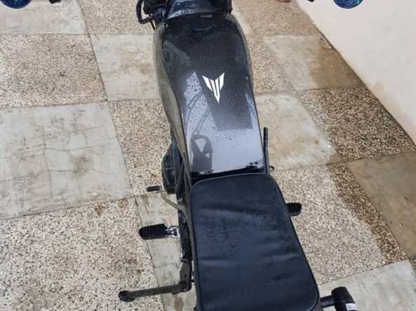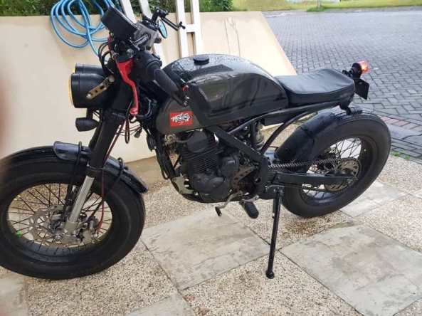 Penutup, sekujur body hingga mesin dan roda, kompak diberikan kelir hitam gelap. Sangar sekaligus menyamarkan identitas motor yang awalnya jangkung. Pelengkap sebagai kendaraan tertib lalulintas, sepasang spion bar end alias terpasang di ujung setang , dan sein depan produk variasi nemplok di bawah lampu depan.