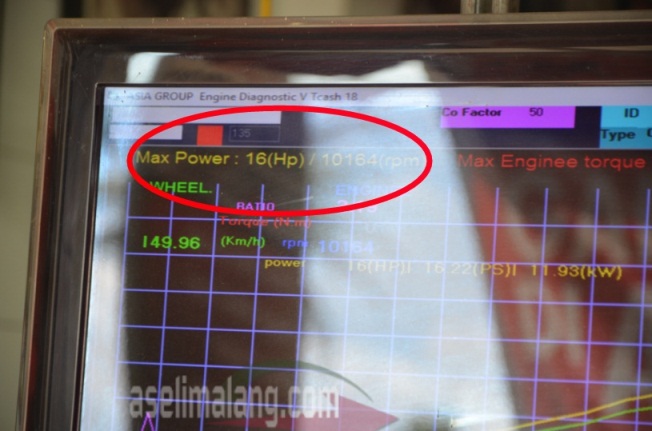 Gak panjang lebar, coba 2x run diatas mesin dyno, tanpa service dan ubahan apapun. Dan hasilnya, lumayan mantap ternyata. Tenaga naik 0,5 hp. Cuma segini? Yups, dengan penggantian knalpot saja, nggak ada ubahan lain di mesin, angka 16,5 HP terpampang di layar. Saia pikir sih lumayan juga kok, mengingat, dari banyak referensi, penggantian knalpot racing biasanya memang dongkrak tenaga maksimal sekitar 1 HP saja. Tergantung model knalpot juga