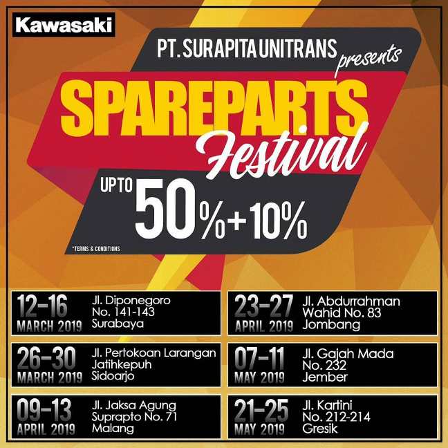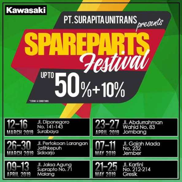 Yuk, yang lagi butuh dan cari spare part Kawasaki, bisa merapat ke Surapita Unitrans Malang. Khusus Malang, promo ini berlangsung mulai tanggal 9 April hingga 13 April 2019. Dealer lain di wilayah kerja Surapita Unitrans, bisa simak jadwalnya ya..
