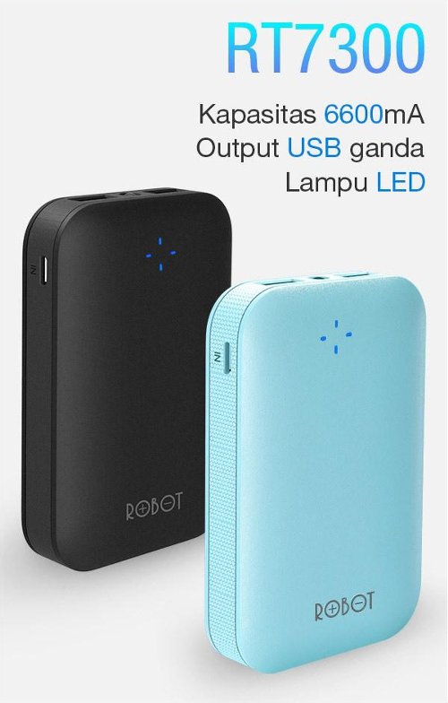 Power bank satu ini memiliki brand robot dengan model RT130 dual port USB, berkapasitas 10.000 mAh yang dapat digunakan hingga 3x penggunaan pada smartphone berkapasitas besar diatas 3.000 mAh. Dapat digunakan pada ponsel Android, iPhone, iPod, iPad, Tablet PC, PDA Bluetooth headset dan sebagainya.