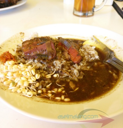 Disajikan dalam piring, seporsi rawon campur hadir dengan potongan daging dibagian atas, bersamaan dengan kuah khas hitamnya. Pelengkapnya, jelas sambal dan tauge pendek. Orang Malang bilang sih, cambah.