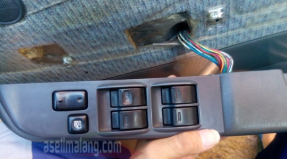 Beberapa waktu belakangan ini, tombol pembuka kaca pintu depan sebelah kiri, alias power window, sering nggak berfungsi. Yaitu saat diakses dari panel sopir. Kalau akses dari pintu depan kiri sih, nggak ada masalah, baik membuka/turun ataupun menutup/naik. Penasaran, karena saia membatin, paling nih, hanya saklarnya saja yang bermasalah , akhirnya saia coba bongkar sendiri pas libur.