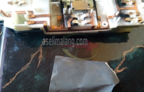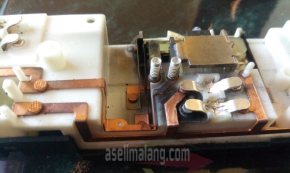 Usai dibersihkan, nampak kerak yang menempel pada plat gesernya. Inilah penyebab switch macet, karena nggak terhubung antara plat geser dan terminalnya. Solusinya, cukup digosok dengan amplas halus untuk menghilangkan kerak halus yang menghalangi kontak antar terminal.