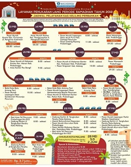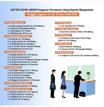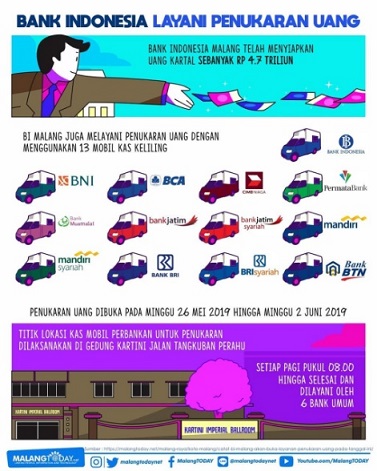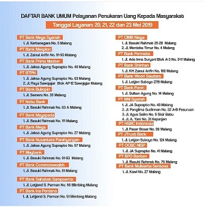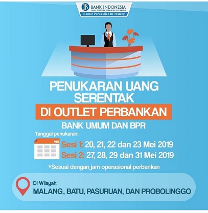 Buat yang nggak pengen lewat jasa ini, pihak perbankan, dalam hal ini Bank Indonesia cabang Malang, sudah menyiapkan lokasi dan armada khusus, yang siap menerima penukaran uang kertas baru. Jadwal penukaran uang baru ini, akan dibuka mulai 26 Mei hingga 2 Juni 2019.