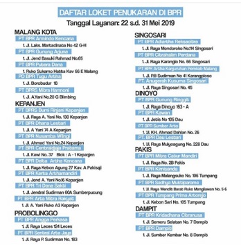 Khusus kota Malang, titik lokasi kas mobil Perbankan untuk penukaran bersama akan dilaksanakan di Gedung Kartini Jalan Tangkuban Perahu setiap pagi pukul 08.00 hingga selesai dan dilayani oleh 6 Bank Umum. Catet nih… Lokasinya, sebagai ancer-ancer, adalah tepat di area Stadion Gajayana. Sebelah timurnya, dekat pintu gerbang.