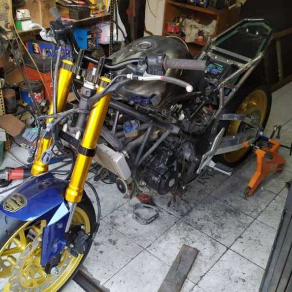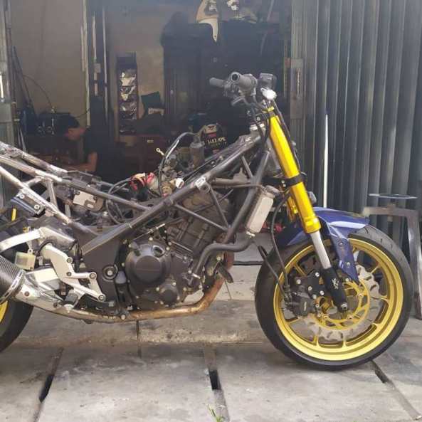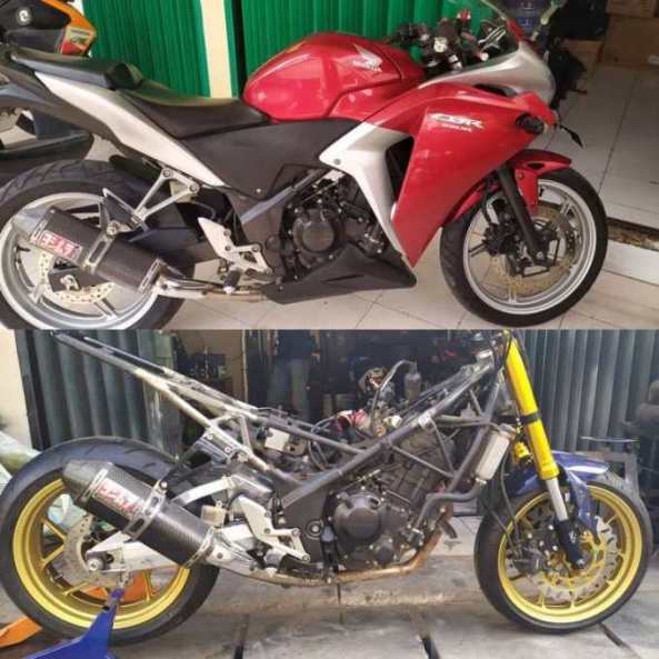 Secara basis rangka, hampir mirip memang, sama-sama pakai model teralis. Dimensinya yang berbeda, dan ada beberapa bagian yang berbeda. Makanya, ubahan sasis alias rangka, ada yang dipotong, ditekuk dan sebagainya, dnegan mengacu pada bentukan si Cemen. Lha CBR250RR kan lebih sporty, makanya area tengah dan buntut belakang jadi fokus modifikasi. Gerinda dan las, berperan deh
