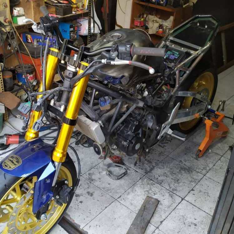 Karena populasi nggak begitu banyak, dan harga jual yang gelap, ditengah gempuran mesin 250cc yang sudah 2 silinder, pemiliknya memutuskan untuk memodifikasi. Pilihannya, memang cocok. Rumah modifikasi om Yusa, yang beberapa hasilnya sering banget nongol di blog ini, hehehehe. Secara sih, piaraan kami sama, Honda CB150R 😆