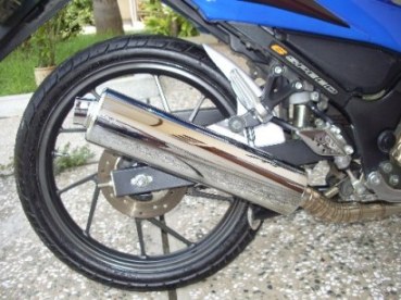 Yang ini masih jarang ditemukan. Masih dari motor pabrikan Suzuki bermesin 150cc, silincer GSX150 punya desain unik. Membesar banget di ujungnya, dengan keluaran 2 buah lubang buang. Ajib
