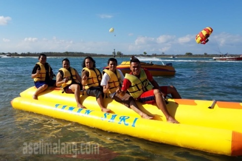 Perut kenyang, aktifitas adrenalin sudah menunggu. Yaitu yang basah-basah. Area wisata air di ujung Nusa Dua menjadi tujuan selanjutnya. Pilihan seru yang bisa dinikmati bareng-bareng ya apalagi kalau bukan banan boat. Perahu karet panjang berbentuk mirip pisang ini, bukan mainan baru buat saia dan beberapa rekan. Tapi, tetep, kala di akhir permainan dan sang joki motorboat usil, si pisang pun terbalik dan sukses menenggelamkan semua penumpang ke laut