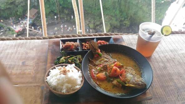 Bayangkan, makan siang sambil nonton air terjun, plus suguhan house music yang berdentum, po ra penak tenan? Dengan hidangan andalan tempat ini berupa olahan ikan dengan aneka sambal khas Bali