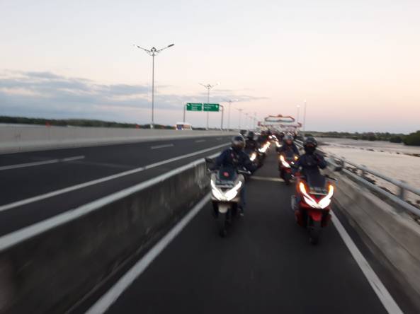 Setelah melewati gerbang tol, kami berhenti sejenak menata barisan supaya rapi dan nggak mengganggu pengguna jalan lain, meski pemotor lain terbilang sepi saat itu. Nyaris nggak ada motor lain yang melintasi. Akhirnya, saia melintasi ini tol untuk kali kedua, setelah tahun lalu sempat melintas dengan motor saat sowan ke rumah juragan motoblast.org.