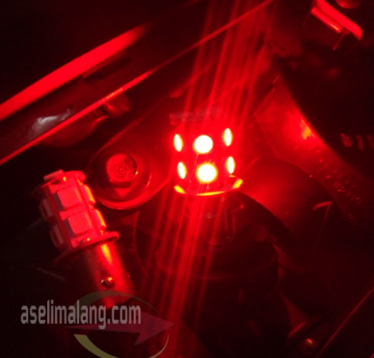 Karena nggak menyeluruh, alhasil, upaya memberikan efek warna merah ini gagal. Tetap silau, kalau saia bilang. Lha saia pas dibelakangnya, apalagi pas ngerem.