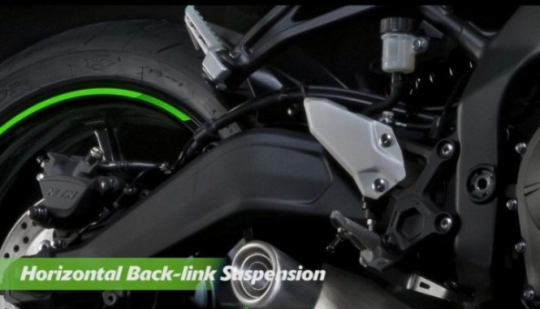 Sokbreker belakang, jelas menggunakan monoshock. Yang bikin beda, selain terpasang pada lengan ayun almunium model pisang/banana, si monosok juga posisinya miring nyaris tiduran. Nggak lagi tegak seperti Ninja 250 sebelumnya.